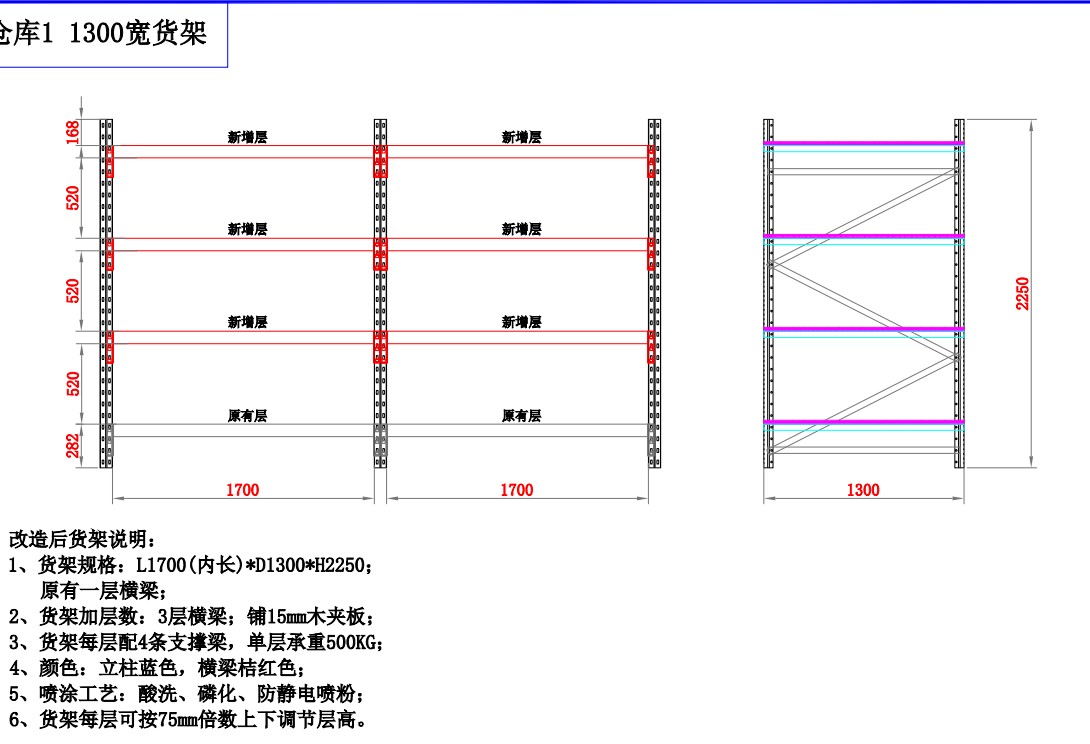 首先當我們預留空間時,我們需要考慮很多因素。其中之一是貨架每層的高度。通常是根據貨物的高度來設計的。考慮到整個貨架的安全性,我們會根據貨物的高度留出更多的空間,這部分空間就是安全空間。因為如果儲物架的高度與貨物的高度相同,叉車將非常不方便取貨。它可能會與貨架碰撞和摩擦。如果你留出一定的空間,這個問題就可以解決.定制貨架尺寸為:長1700*寬1300*高2250 數量:4套 原有一層橫梁 2、貨架加層數:3層 鋪15mm木夾板 貨架每層配4條支撐梁,單層承重500KG 每層可按75mm調節高度