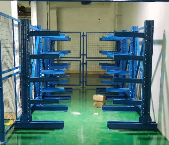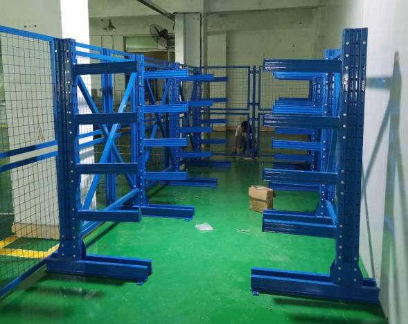 懸臂貨架的橫梁是一頭固定,另外一頭懸空,所以理論上不管多長的物品都能放上懸臂架,際應(yīng)用中常用于管材、鋁材、以及板材。通常懸臂貨架都為人工上下貨物,也可配合側(cè)取堆高機(jī)上下貨物,正取也行,但通道需要非常大。這種款式貨架有單臂和雙臂之分,專用立柱型材,設(shè)計(jì)背拉增強(qiáng)穩(wěn)固性,高強(qiáng)度懸臂,每臂可承重2000KG以上,高度可在100mm以內(nèi)上下調(diào)節(jié)。以下是我公司根據(jù)場地實(shí)際情況為客戶定做的倉庫貨架如圖: