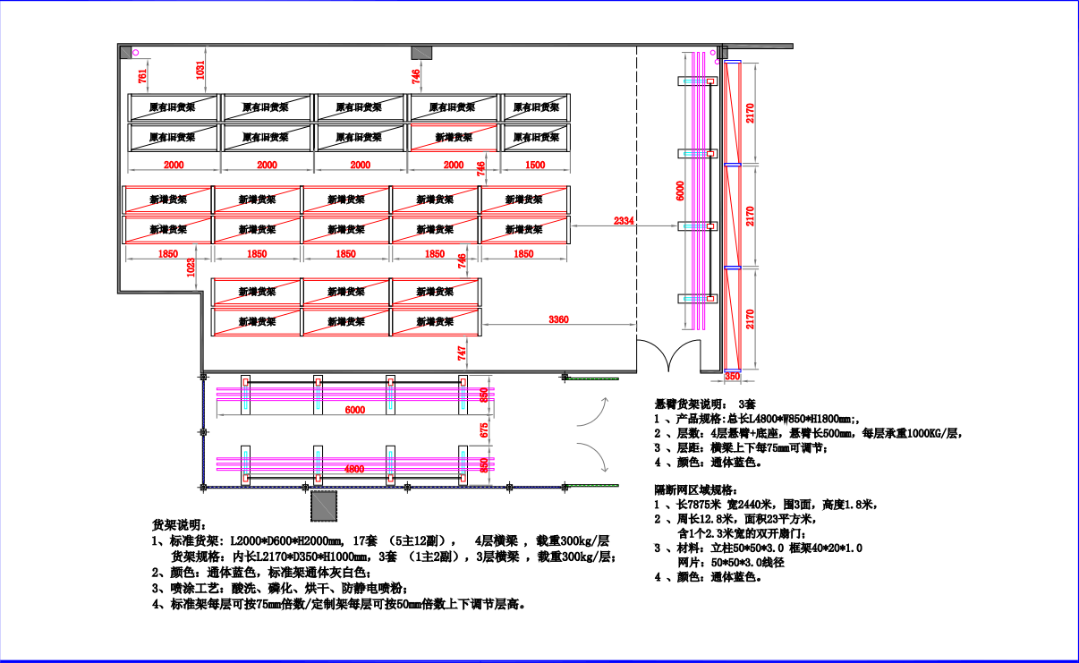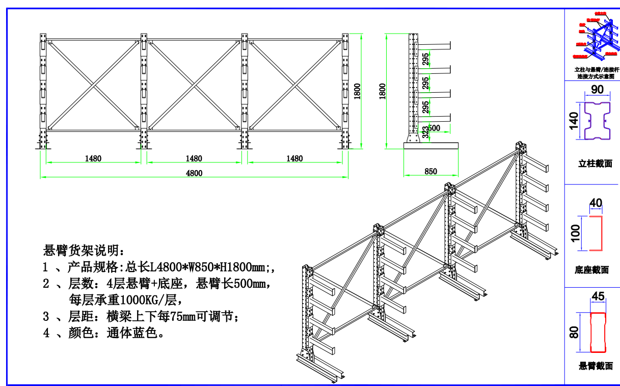 懸臂貨架說明:規(guī)格L4800*W850*H1800 層數(shù) 4層懸臂+底坐,懸臂長500. 每層承重1000KG/層,層間距:橫梁上下每75mm可調(diào)節(jié)  顏色:通體藍色