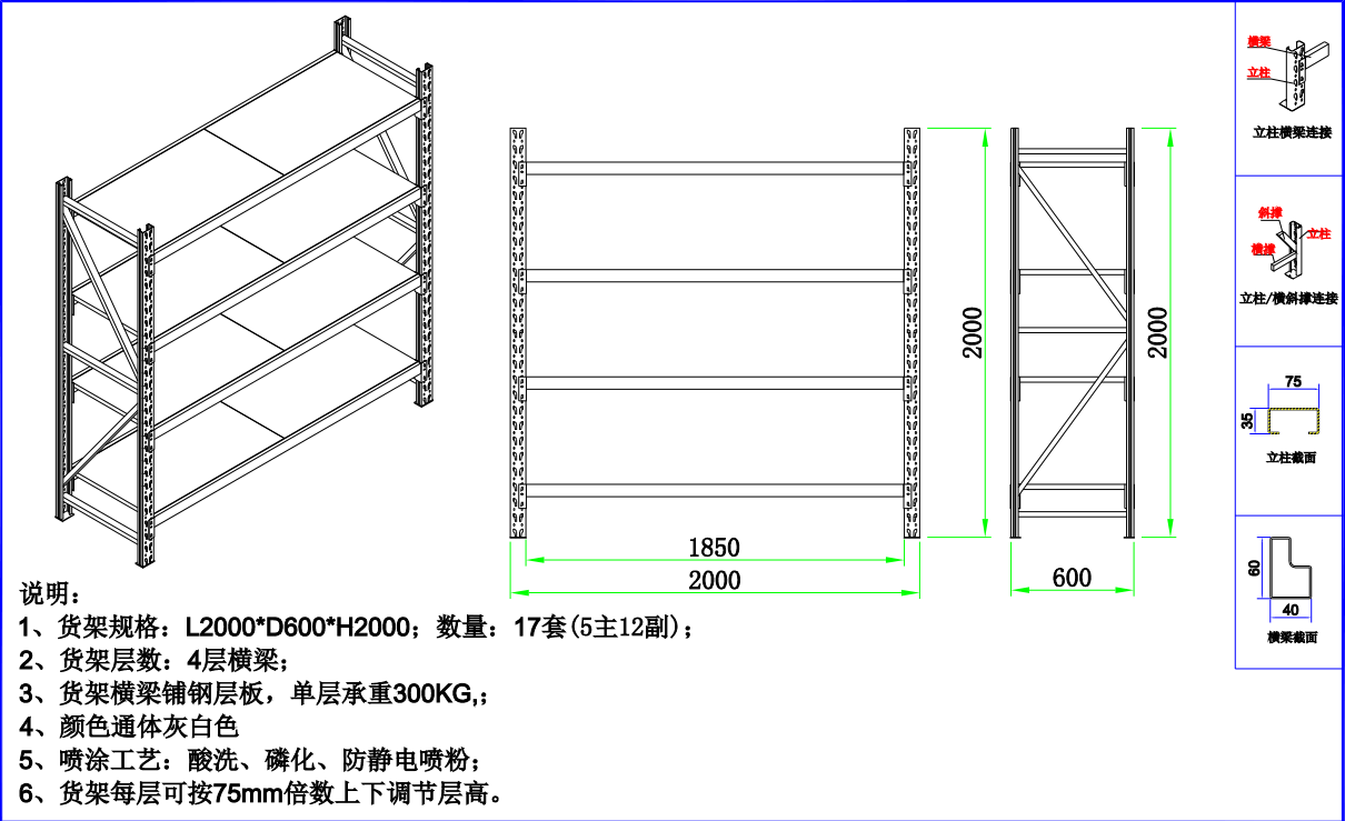 貨架說明:標準貨架 L2000*W600*H2000 5主12副 4層橫梁 載重300KG/層  貨架規(guī)格:內(nèi)長L2170*W350*H1000 顏色:通體藍色,標準貨架灰白色 3、噴涂工藝:酸洗、烘干、防靜電噴涂 標準貨架每層可按75mm倍數(shù)/定制架每層可按50mm倍數(shù)上下調(diào)節(jié)層高。